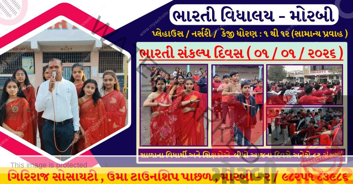 મોરબી – ૨ વિસ્તારમાં આવેલી ભારતી વિધાલય શાળામાં અંગ્રેજી વર્ષના પ્રથમ દિવસને ~Happy New Year~ ની જગ્યાએ ભારતી સંકલ્પ દિવસ તરીકે ઉજવાયો.જેમાં શાળાના દરેક વિધાર્થી અને શિક્ષકોએ પોતાના જીવનના ઉચ્ચ સપનાને સાકાર કરવા માટે દ્રઢ સંકલ્પ લીધો અને તે સંકલ્પને પૂર્ણ કરવા માટે તે શું મહેનત કરશે ? તેની પણ લેખિત નોંધ કરેલ.તેની સાથે સામૂહિક દરેકે પોતાના માતા – પિતા અને ગુરુજીને અને વડીલોને હર હંમેશ આદર સત્કાર કરશે તેમજ એવું એક પણ કાર્ય નહીં કરે કે જેથી તેના કુળ – સમાજ – દેશને લાંછન લાગે જેવો કટિબધ્ધ સંકલ્પ લીધેલ.શાળાના સંચાલક શ્રી કૌશલભાઈ મહેતાએ પશ્ચિમી દેશોના તહેવારનું અનુકરણ કરવા કરતાં આપણી અમૂલ્ય ભારતીય સંસ્કૃતિને ટકાવી રાખવા અને જાળવી રાખવા માટે દરેક વિધાર્થી અને શિક્ષકોને માહિતી આપેલ.શાળા પ્રમુખ શ્રી હિતેશભાઇ મહેતાએ આપણી ભારતીય સંસ્કૃતિ વિદેશી સંસ્કૃતિ થી શા માટે વધુ ચડિયાતી છે તેની સવિશેષ માહિતી આપેલ સાથે તમામને વિદેશી સંસ્કૃતિ કરતાં ભારતીય સંસ્કૃતિ અપનાવવા માટે અપીલ કરેલ.કાર્યક્રમને સફળ બનાવવા માટે શાળાના શિક્ષકોએ ભારે જહેમત ઉઠાવી હતી